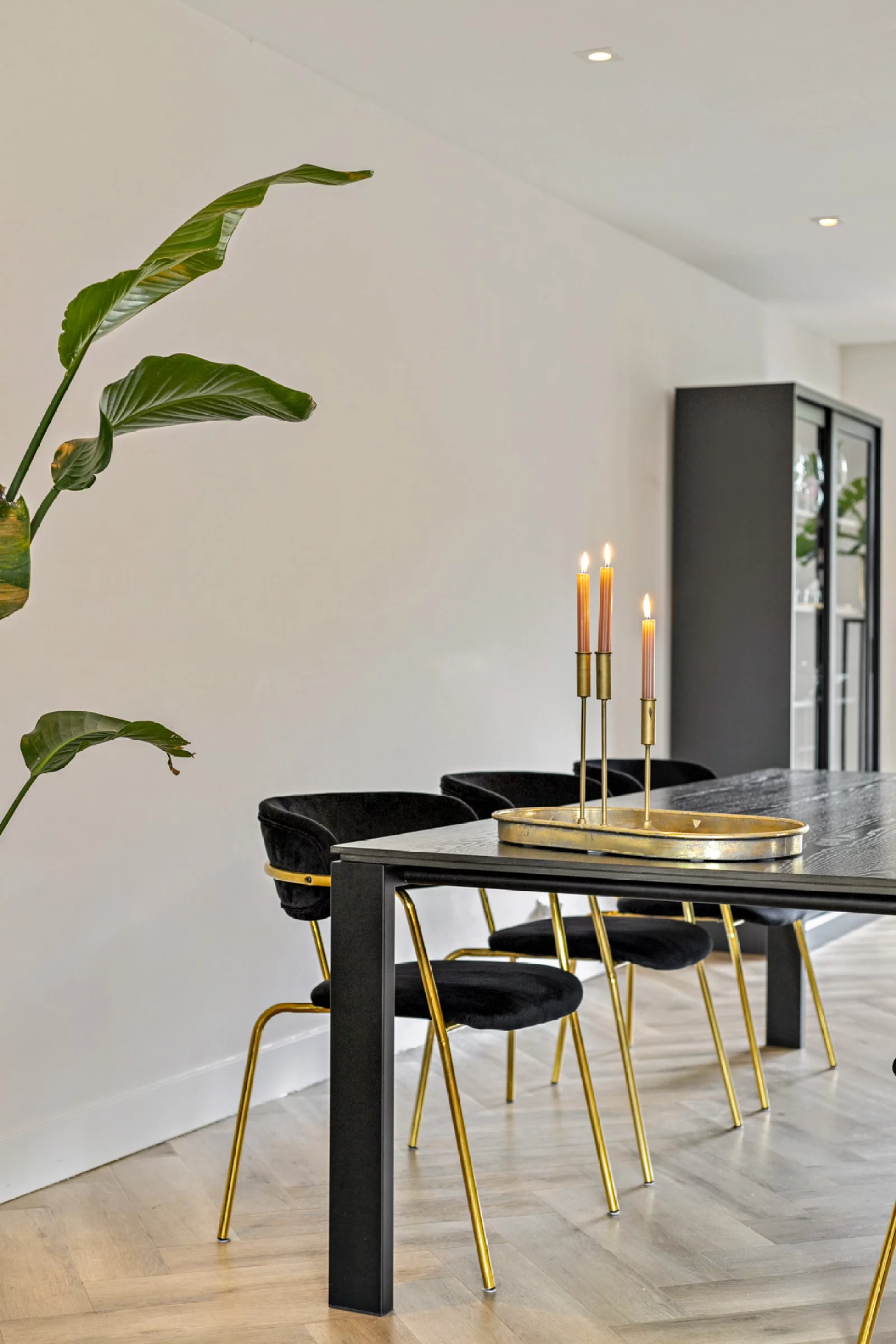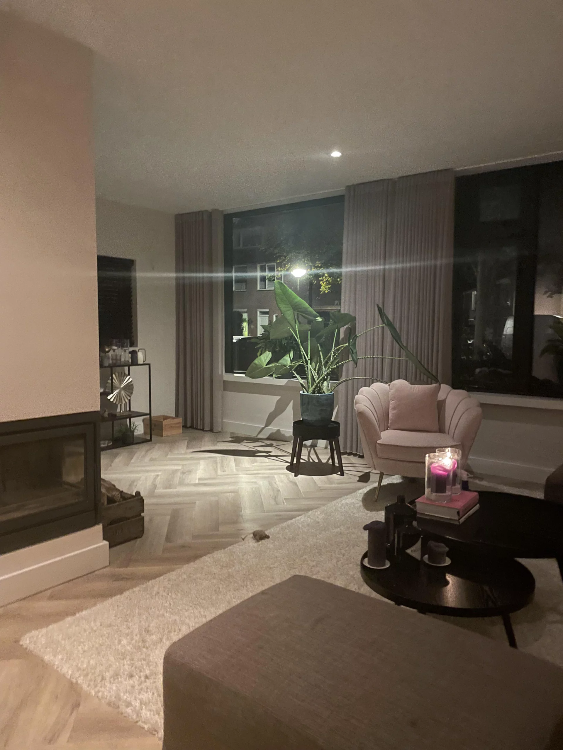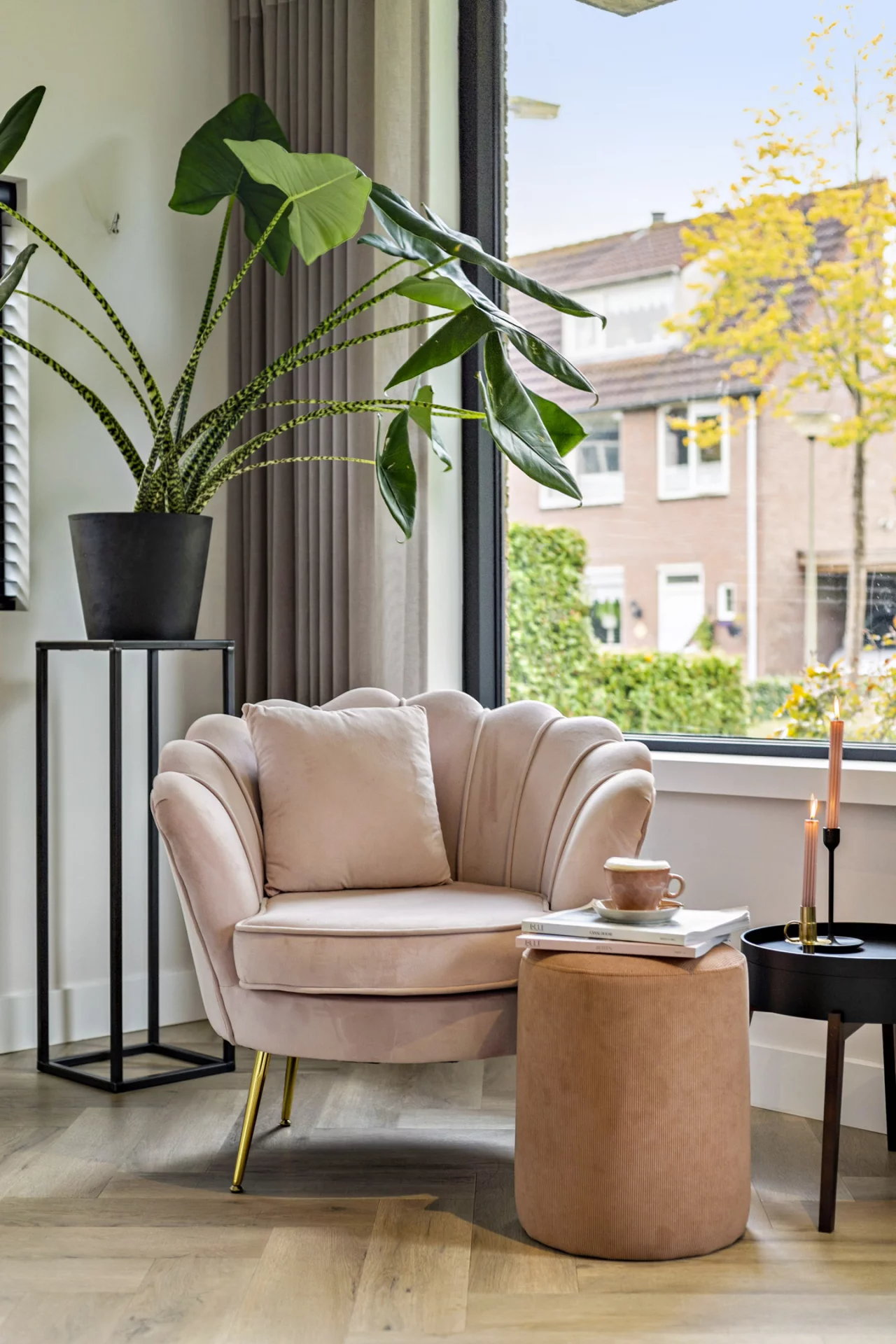 De bewoners van deze woning hebben mij benaderd om mee te kijken, wat te doen in de woning om deze aantrekkelijk te presenteren voor de verkoop. Door het verschuiven van een aantal meubels in de ruimte of naar een andere ruimte en het toevoegen van kleine accessoires is er sfeer toegevoegd en geeft het meteen een ruimtelijker gevoel. De rosé fauteuil is verplaatst naar de hoek en is hier een 'zitje' gecreëerd en hebben bestaande planten een andere plek gekregen. Door een aantal kaarsen, kussens en plaids toe te voegen, veranderd meteen de sfeer. De accessoires zijn qua kleur aangepast aan de aanwezige kleuren zoals rosé en goud.