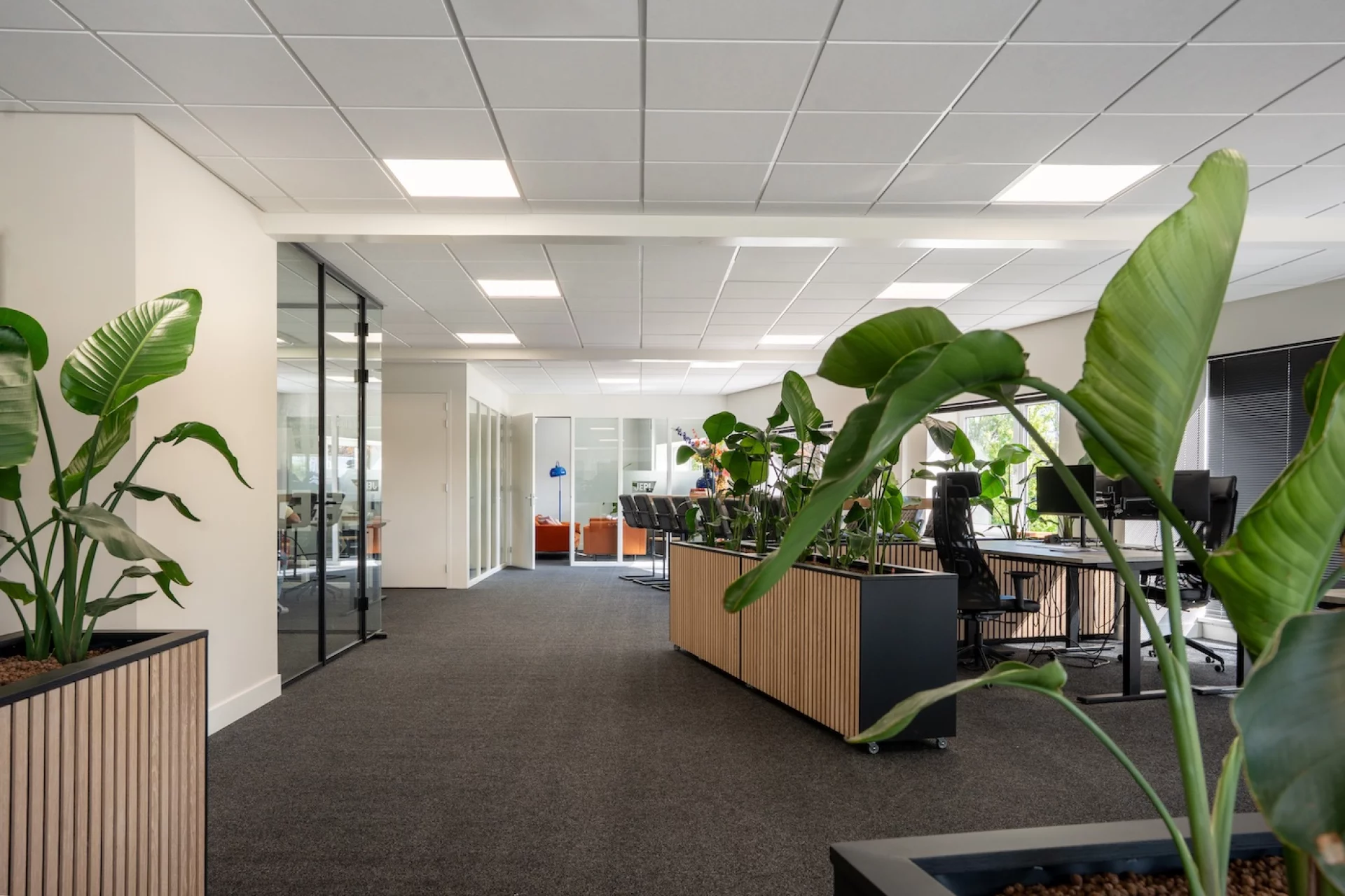 Het uitgangspunt was het behouden van het huidige meubilair, maar de ruimte zo inrichten dat er meubilair toegevoegd kan worden. Door het plaatsen van de plantenbakken met planten, wordt er rust en privacy in één keer gecombineerd. De akoestische panelen op de plantenbakken zorgen ervoor dat het geluid goed reduceert, de planten en de groene kleur ervan, zorgen voor rust en privacy. De plantenbakken zijn verrijdbaar zodat de werkruimte aangepast kan worden.