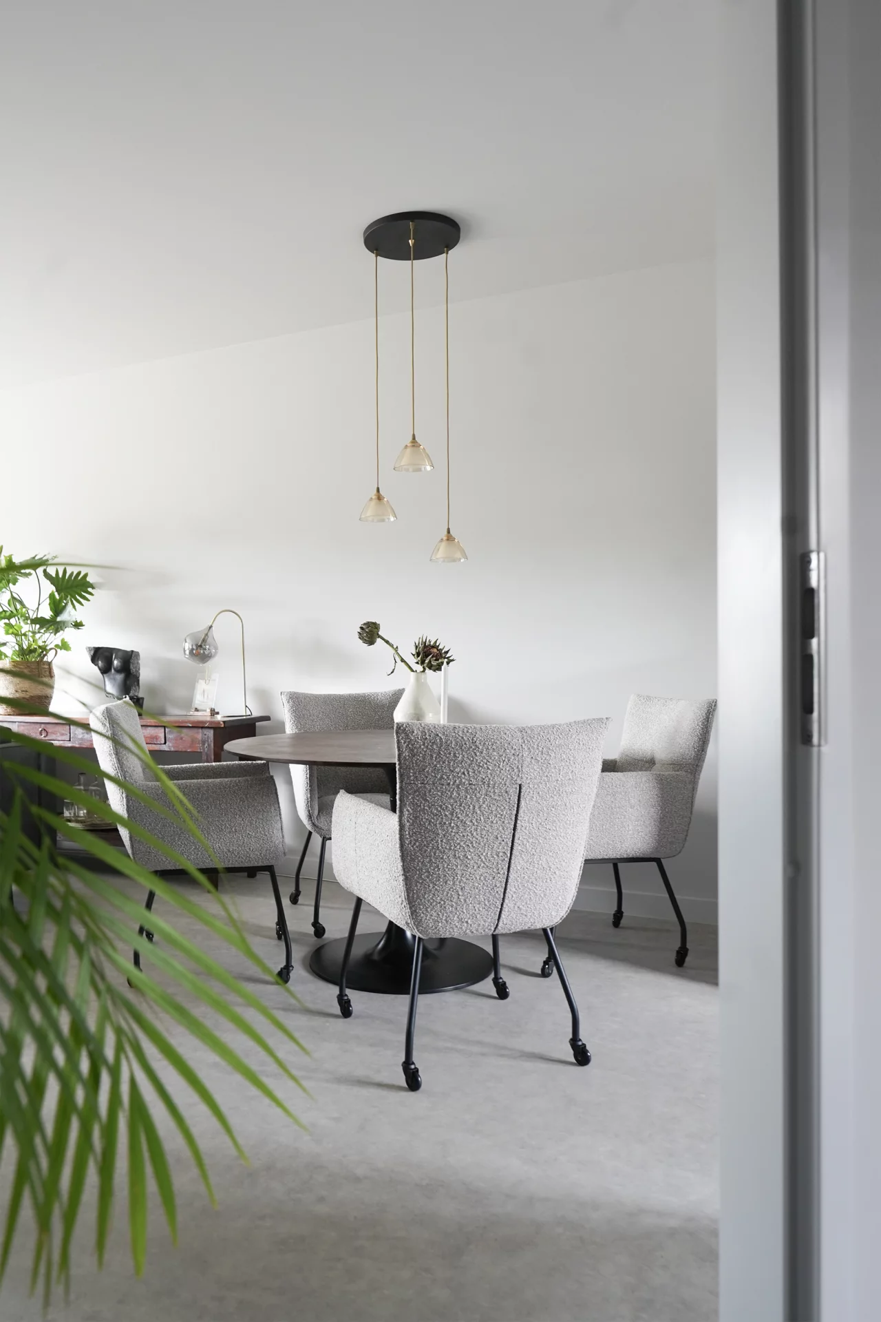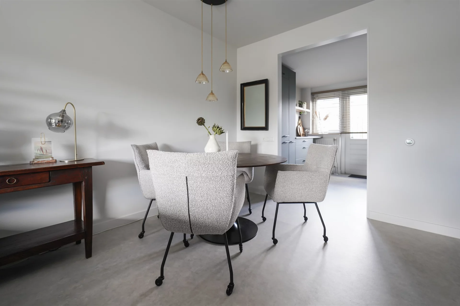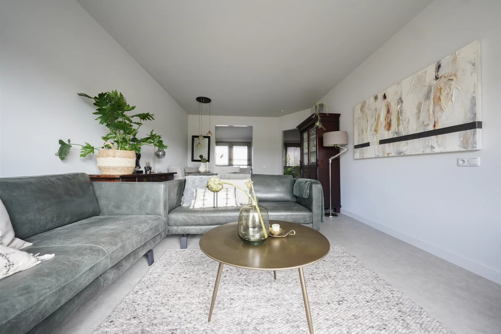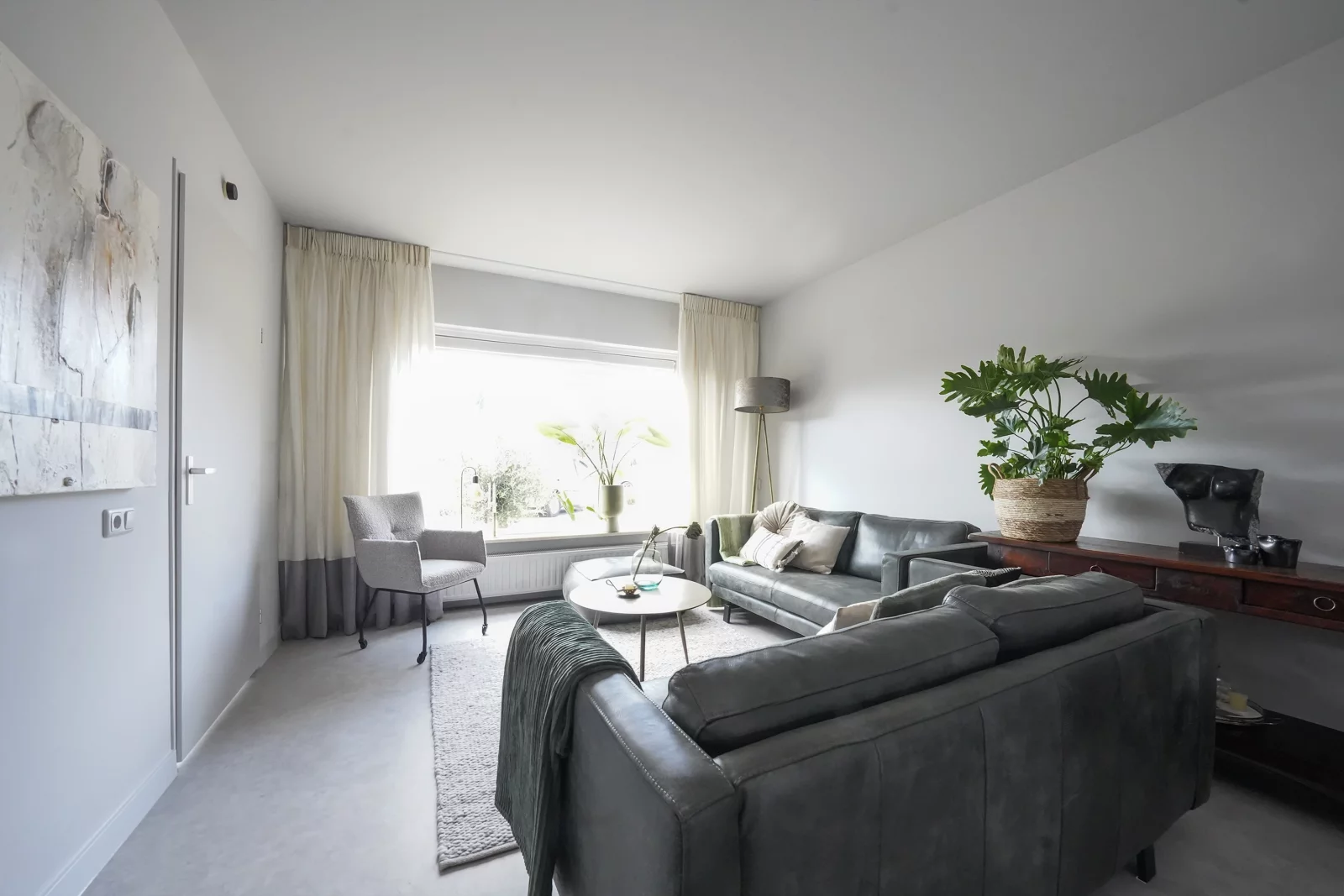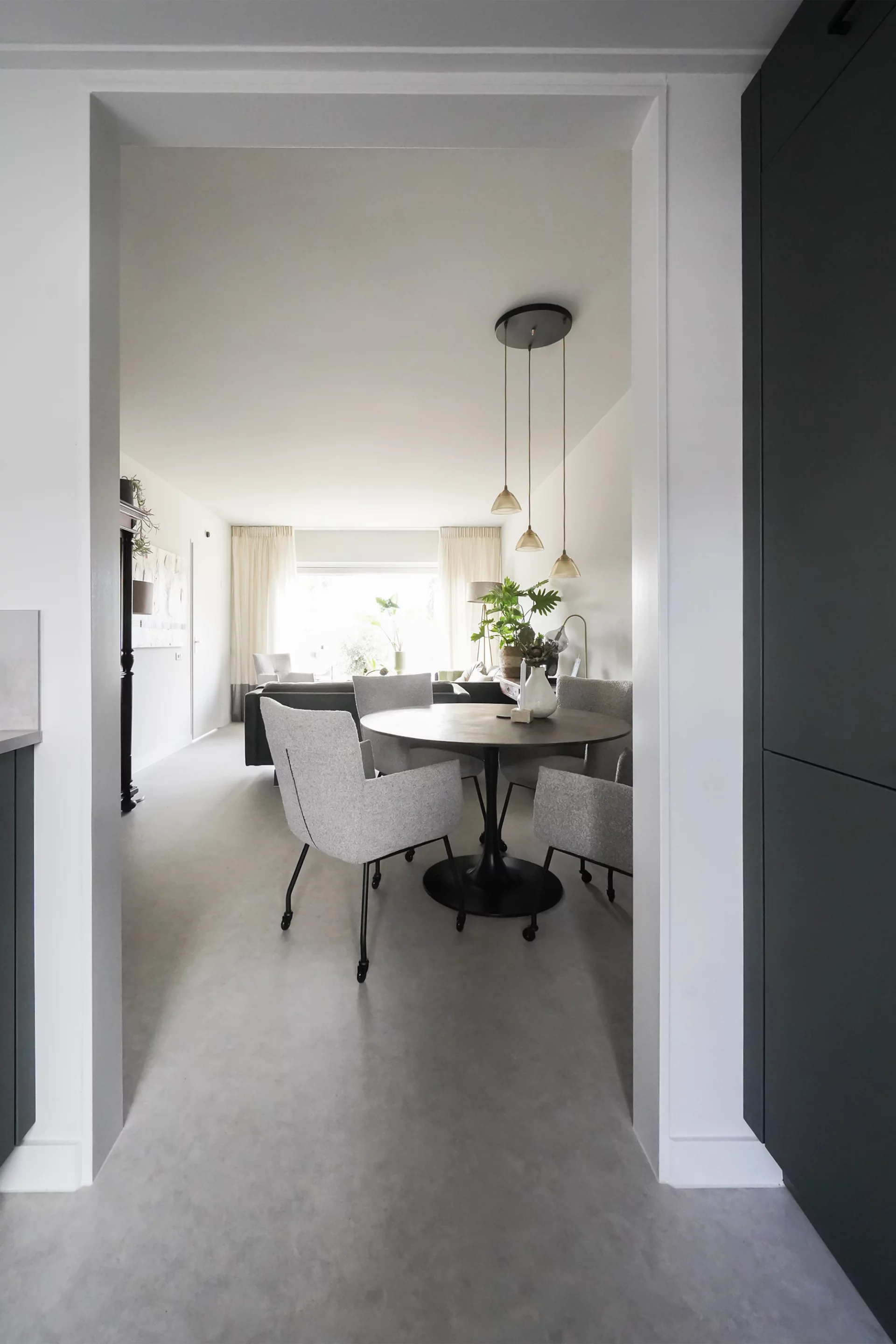Als je altijd witte wanden en plafonds 'rustig' en 'ruimtelijk' vond, was het voor mij een uitdaging om een andere basis kleur te adviseren. Een lichte grijs tint! En ja hoor...deze is toegepast op alle wanden, plafonds, plinten en deuren. Wat een 'rust', 'eenheid' en sfeer geeft deze tint. Door deze kleur zijn er volop mogelijkheden voor het toepassen van extra kleuren, zoals de aanwezige bank in de kleur groen, maar ook de aangeschafte fauteuils, in de kleur grijs aan de nieuwe ronde donker bruine eettafel, combineren mooi met elkaar. De kleur grijs komt ook terug in de vloer, een mooie egale beton look, vinyl vloer in een bijpassende grijs tint.