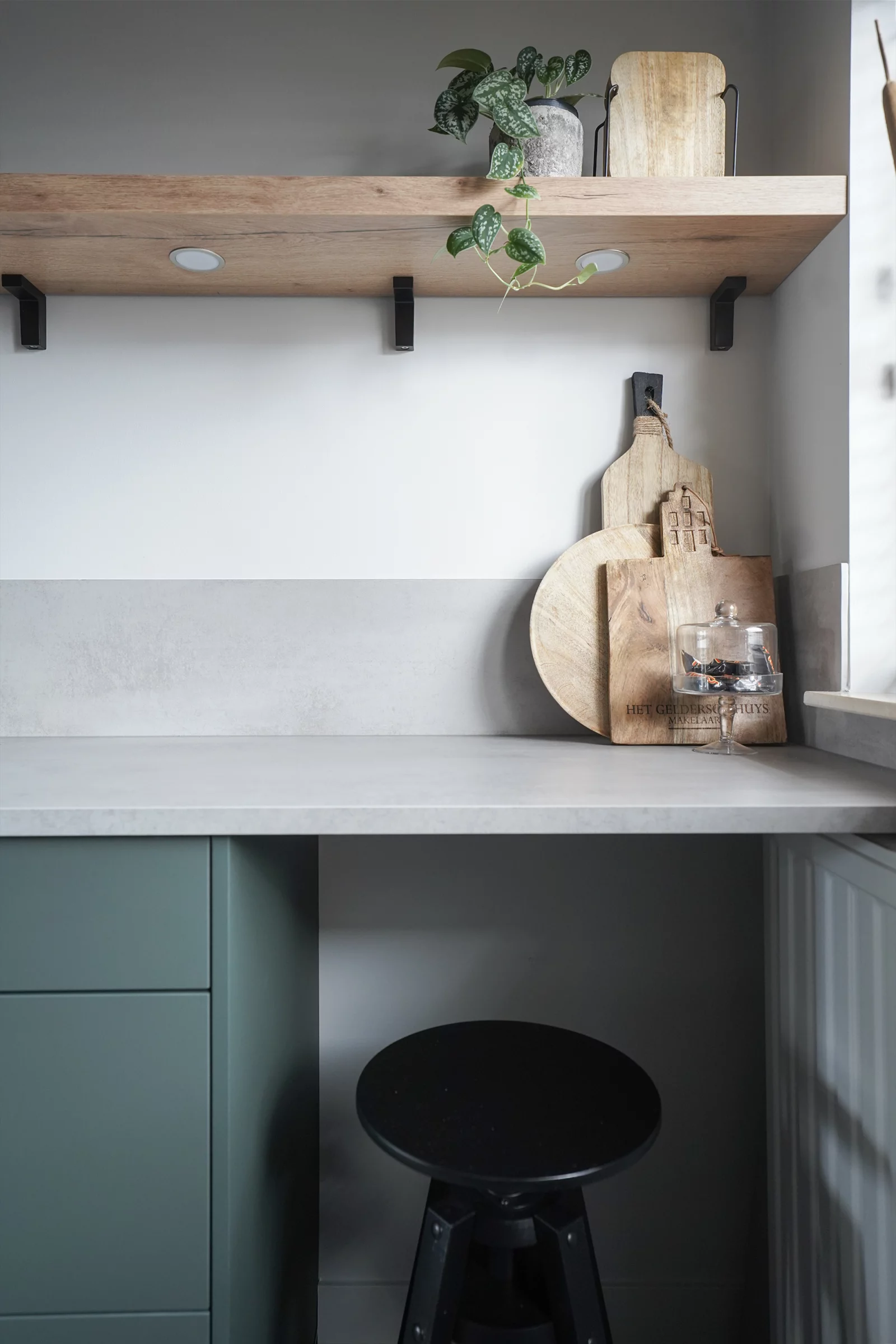 De kleur groen van het bankstel komt terug in de keuken en in de slaapkamer. Hier is gekozen voor een uni linnen-look behang in de kleur groen. De kleurencombinatie groen, grijs en het toepassen van hout en natuurlijke materialen geven rust, brengen sfeer en passen mooi bij bestaande meubels. Doordat in iedere ruimte dezelfde kleuren terug komen, maar anders toegepast worden, geeft dit 'rust' in de gehele woning.