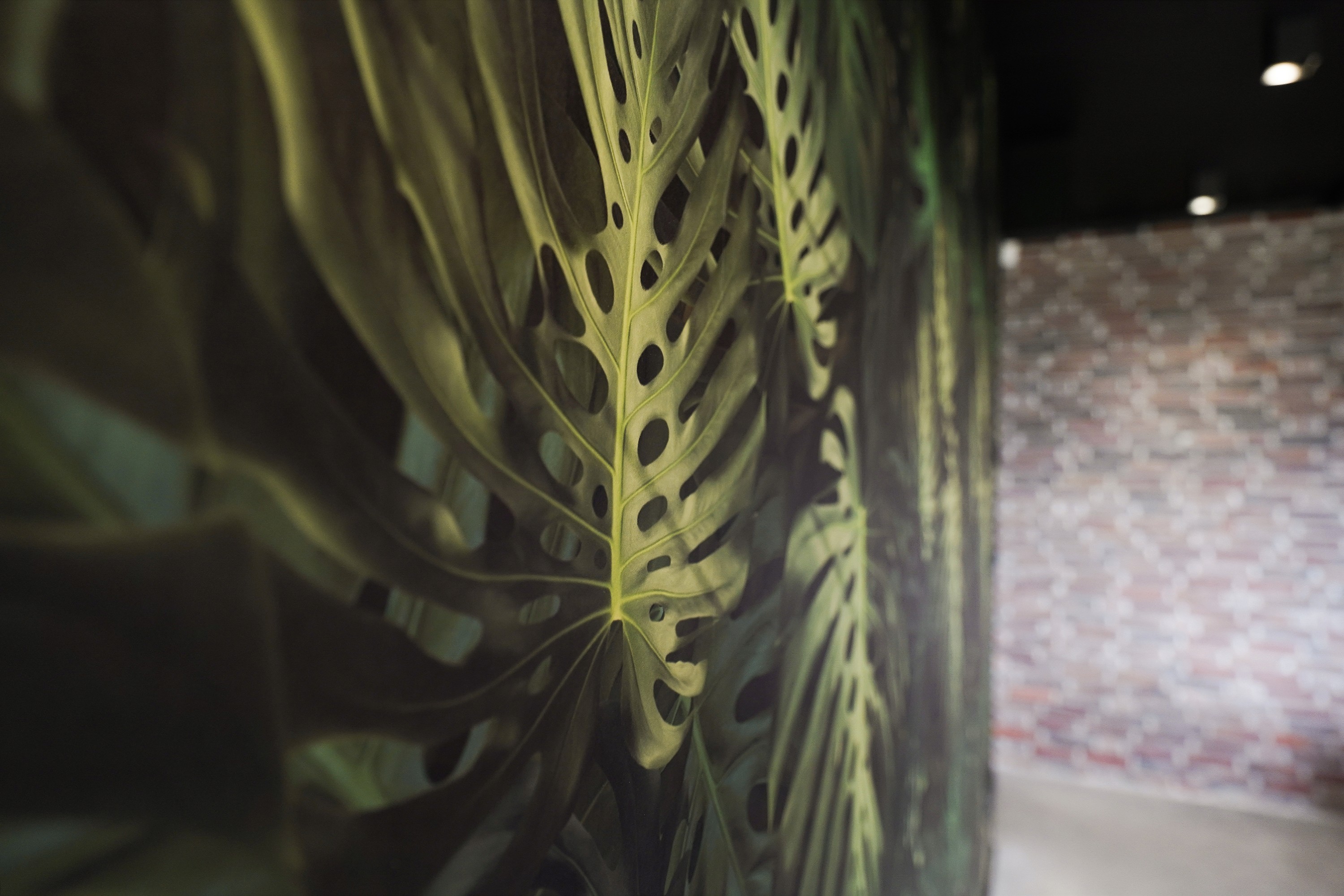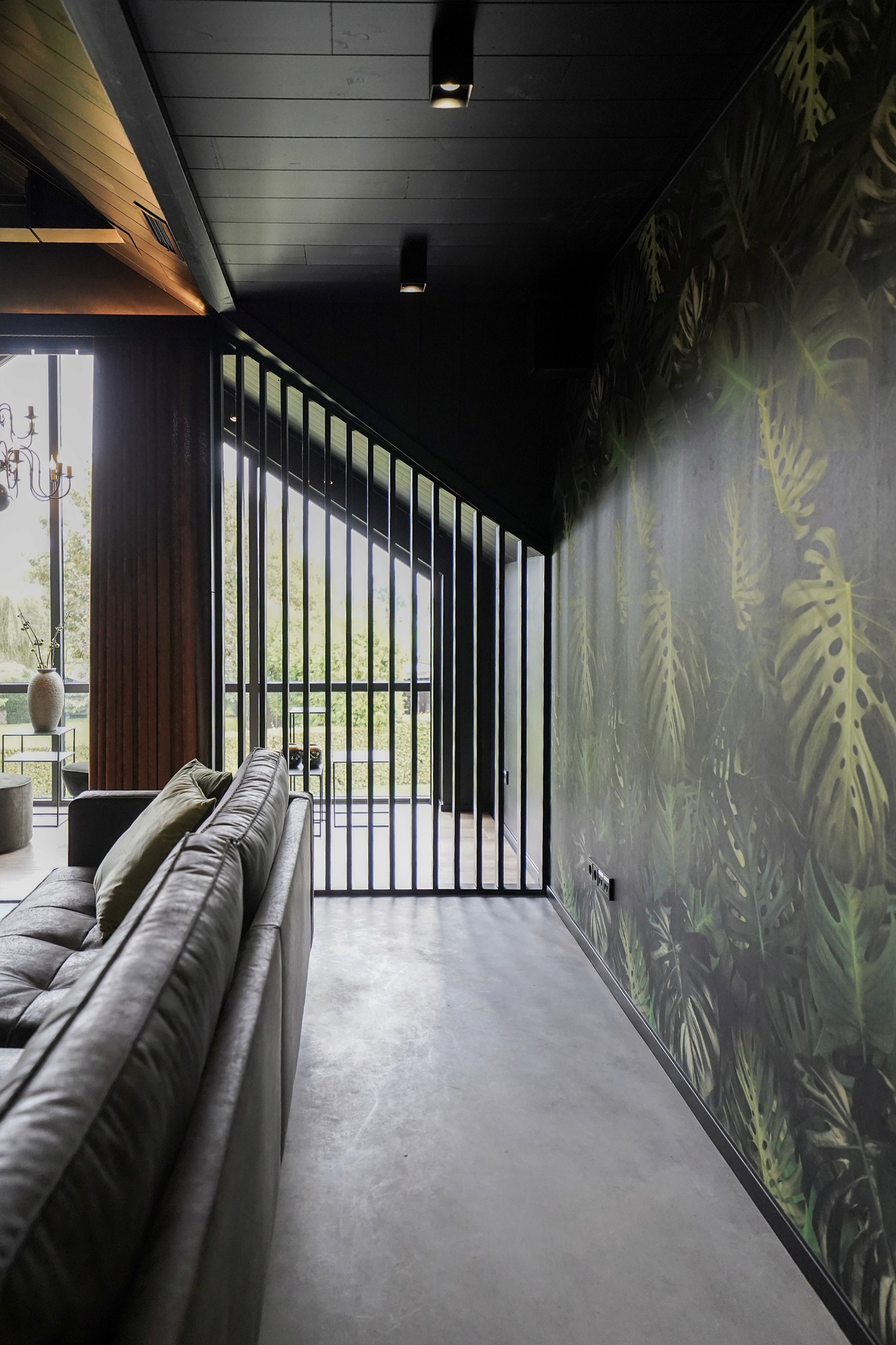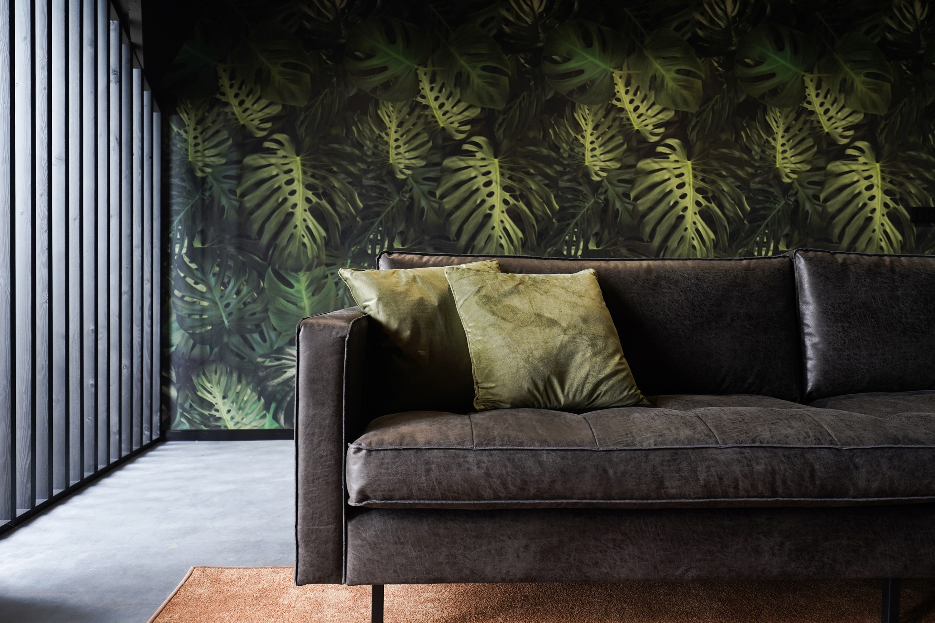 Uitgangspunt in het kleuradvies was de groene kleur van 'Loxone' en de kleuren in de aanwezige bakstenen wand. Het behang uit de KEK collectie, komt hier mooi tot zijn recht. Plafond zwart maken, was gewaagd, maar geeft een behaaglijk gevoel.