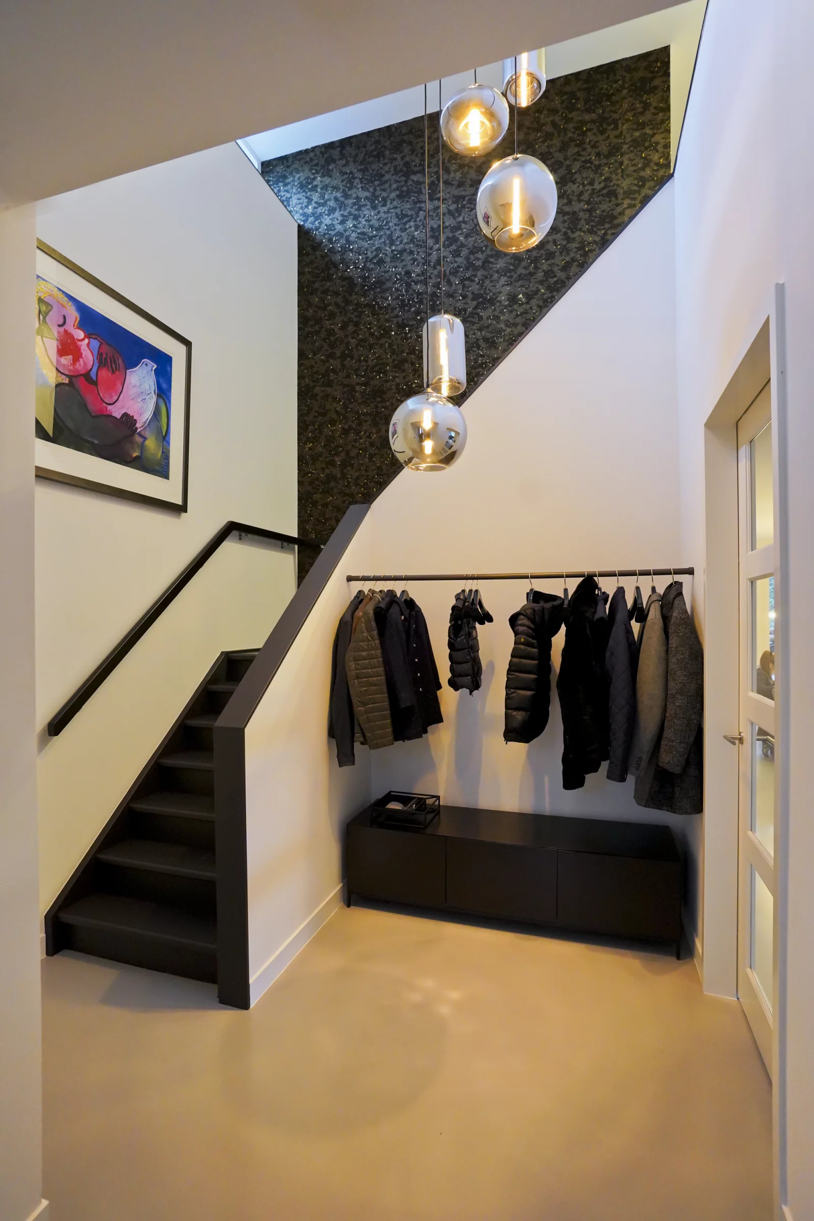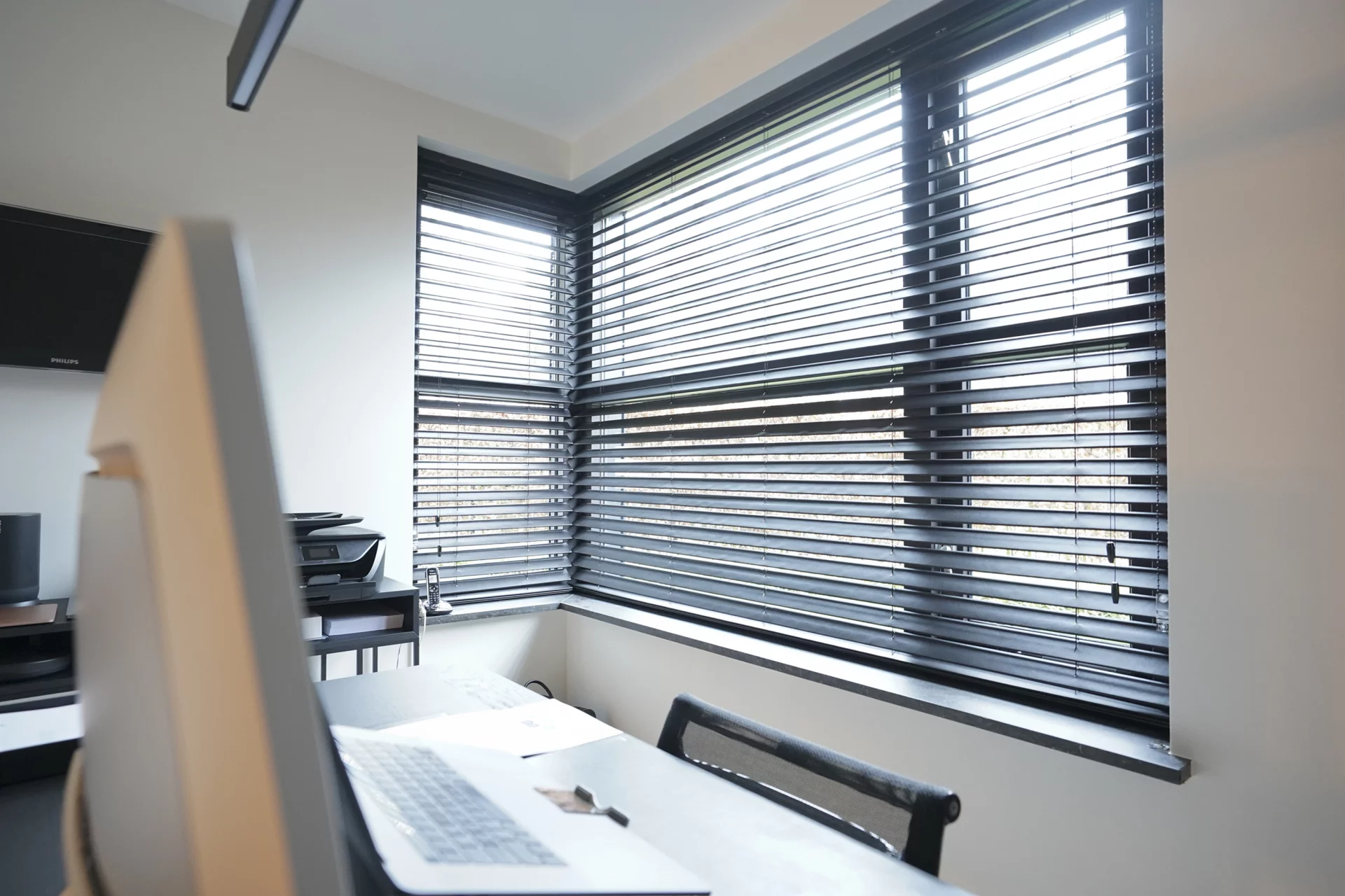 De aanschaf van een andere lamp in de entree nodigde uit om de gehele entree een opfrisbeurt te geven. Waar de kleur wit de hoofdrol speelde adviseerde ik juist het tegenovergestelde. Heel donker bruin, bijna zwart. De trap is in deze kleur geschilderd, het kastje in deze kleur gespoten, de kapstok heeft dezelfde kleur met bijpassende kledinghangers en als finishing touch is er wandbekleding toegepast waarin dezelfde kleur bruin weer terug komt. Dit is spannend als je in gedachten hebt om alles wit te maken en bang bent dat de ruimte te klein en te donker gaat worden met een donkere kleur. Omdat de familie in was voor iets anders en open stond voor verandering, durfden ze het aan om mijn advies op te volgen. Het effect van het donkere kleurgebruik in de entree is een sfeervol en warm binnenkomen. De familie was zo enthousiast dat ze dezelfde sfeer terug wilden laten komen in het kantoor. Het mooie van deze kleur is dat hij zwart lijkt, maar door de lichtval zie je de donkerbruine gloed, dat het geheel chique maakt. Als raamdecoratie hebben we een vlinderjaloezie in het kantoor gebruikt met een look & feel van leer, waarmee het binnenvallend licht goed te regulieren is. Het effect van het leer maakt het plaatje helemaal compleet.