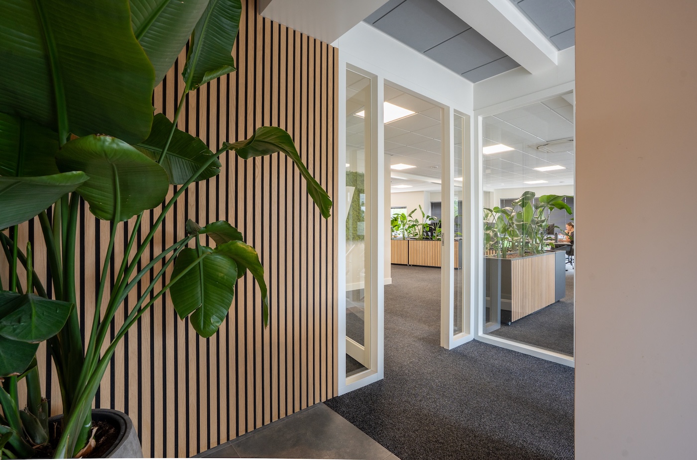 Het uitgangspunt was het behouden van het huidige meubilair, maar de ruimte zo inrichten dat er meubilair toegevoegd kan worden. Door het plaatsen van de plantenbakken met planten, wordt er rust en privacy in één keer gecombineerd. De akoestische panelen op de plantenbakken zorgen ervoor dat het geluid goed reduceert, de planten en de groene kleur ervan, zorgen voor rust en privacy. De plantenbakken zijn verrijdbaar zodat de werkruimte aangepast kan worden.