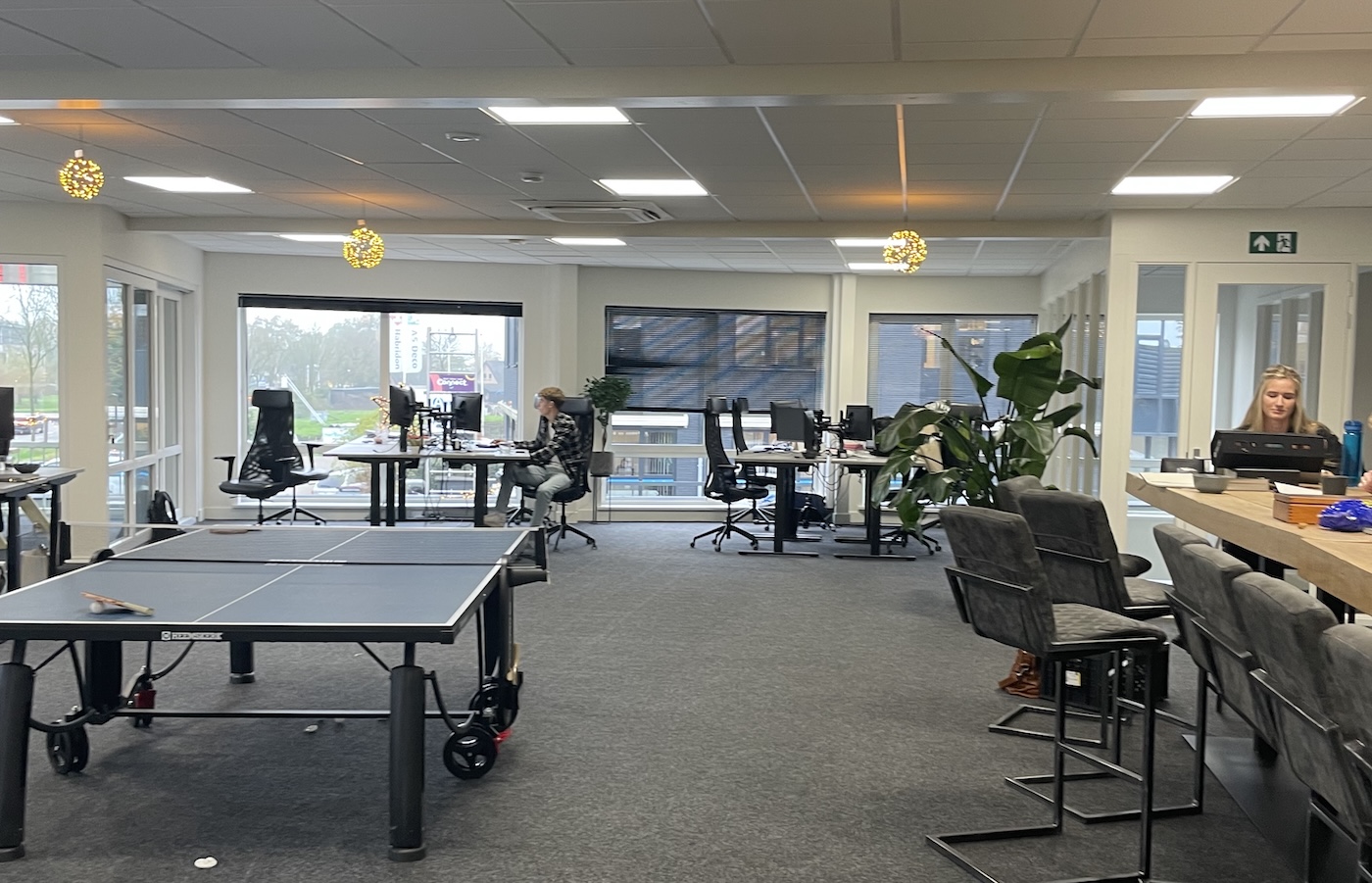 Naast de plantenbakken is er een extra werkruimte/ kantoor gecreëerd, deze zit achter de wand met het logo. Hier stond de grote gezellige tafel. De functie van deze twee plekken hebben we omgedraaid.